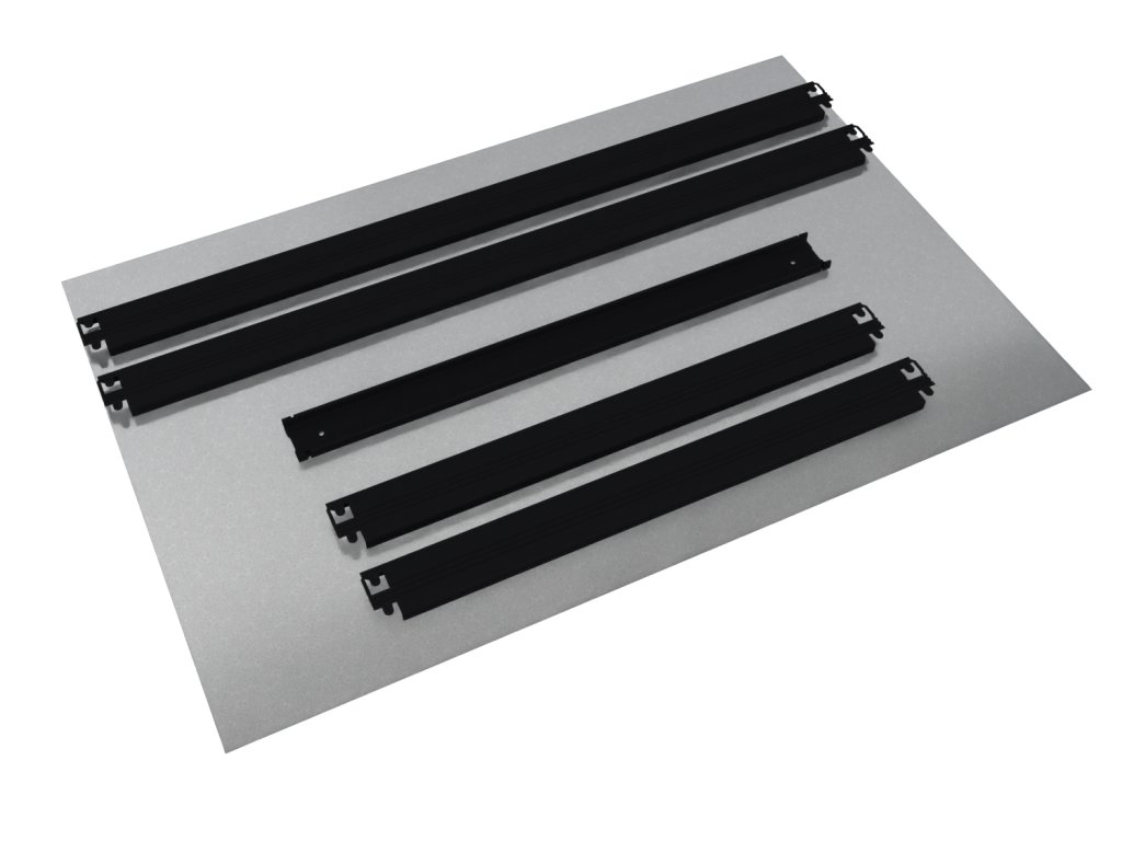 - Die Versteifung wird in die Träger eingeschoben, bevor diese in die Winkelprofile eingerastet werden. Anschließend wird die Versteifung, wie in der Abbildung gezeigt, in die Mitte des Fachbodens geschoben.