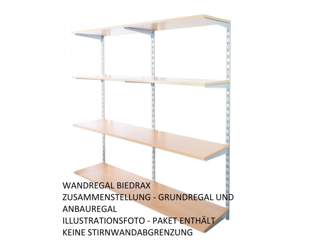 Das Anbauwandregal enthält in der Packung nur eine Lochschiene auf der Wand mit löchern in zwei Reihen. Wenn Sie eine Zusammenstellung von Regalen brauchen, wählen Sie einen Grundwandregal und dazu dann das Anbauregal oder Regalen.