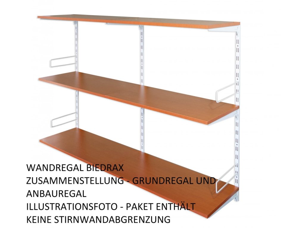 Das Anbauwandregal enthält in der Packung nur eine Lochschiene auf der Wand mit löchern in zwei Reihen. Wenn Sie eine Zusammenstellung von Regalen brauchen, wählen Sie einen Grundwandregal und dazu dann das Anbauregal oder Regalen.