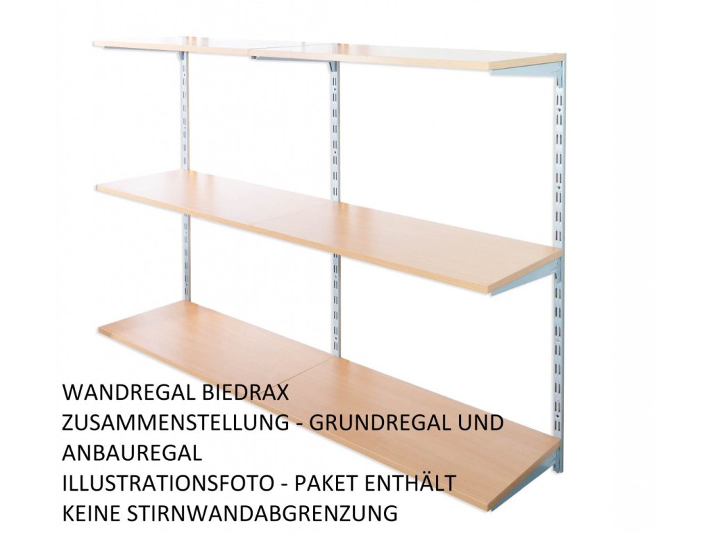 Das Anbauwandregal enthält in der Packung nur eine Lochschiene auf der Wand mit löchern in zwei Reihen. Wenn Sie eine Zusammenstellung von Regalen brauchen, wählen Sie einen Grundwandregal und dazu dann das Anbauregal oder Regalen.
